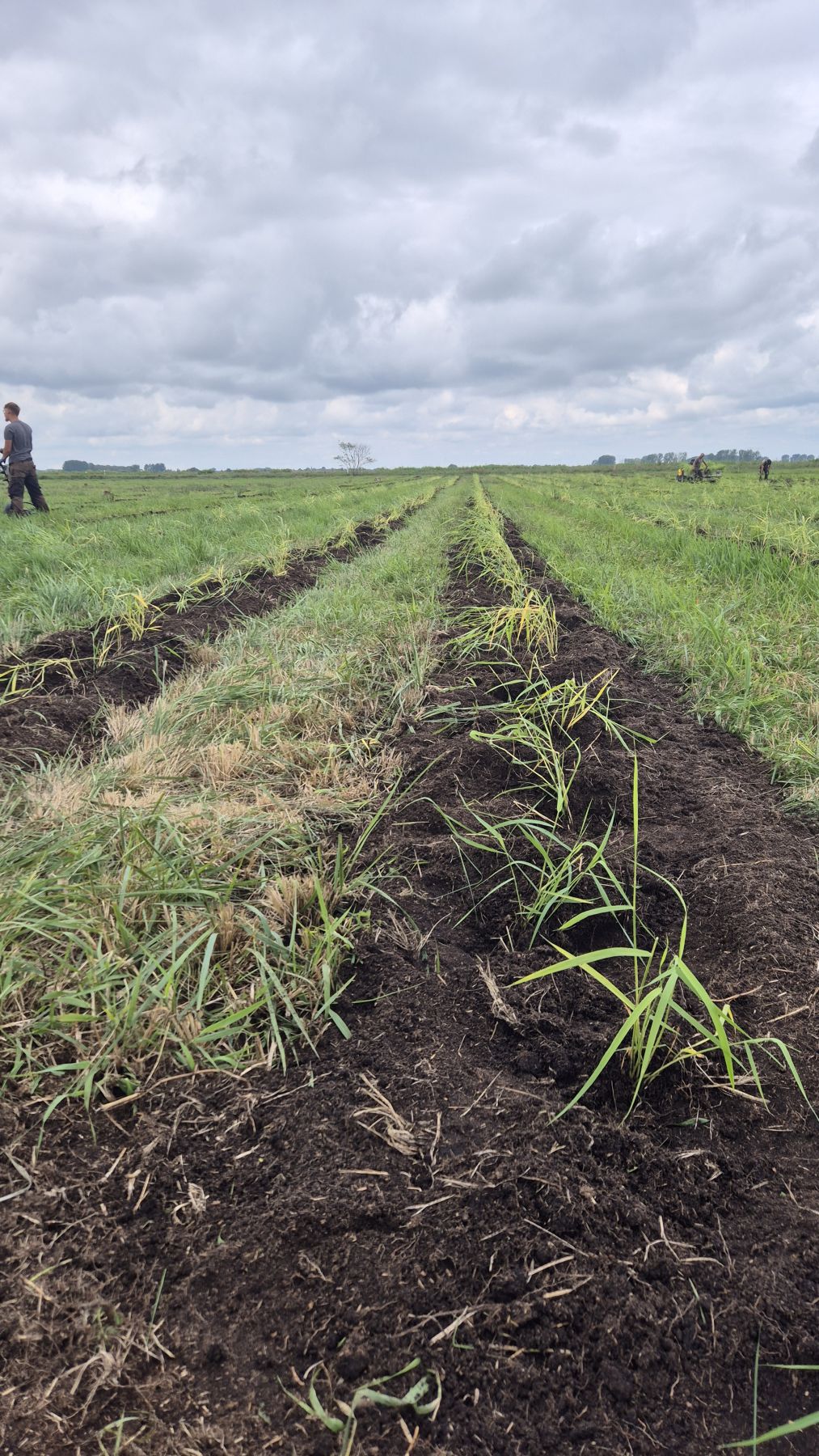 Planting began in mid-July with the preparation of the planting beds. Two approaches were implemented for this: full-area (2 hectares) and partial (9 hectares) tilling of the topsoil. The tilling was intended to reduce competition from existing vegetation, including reed canary grass, tall fescue, and honey grass, on the young reed plants. A total of 80,000 young plants were then planted by hand in holes prepared with earth augers. Under very good conditions, the planting operation managed to plant around 7,000 plants per day. Depending on the micro-relief (altitude) and competitive pressure, different planting densities of 0.5 or 1 plant/m² were used.