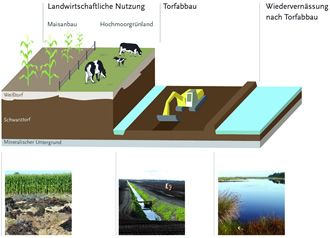 Mosaik degradierter Hochmoorflächen mit aktuellen Nutzungsformen (links) & mit möglicher Torfmooskultivierung (rechts)